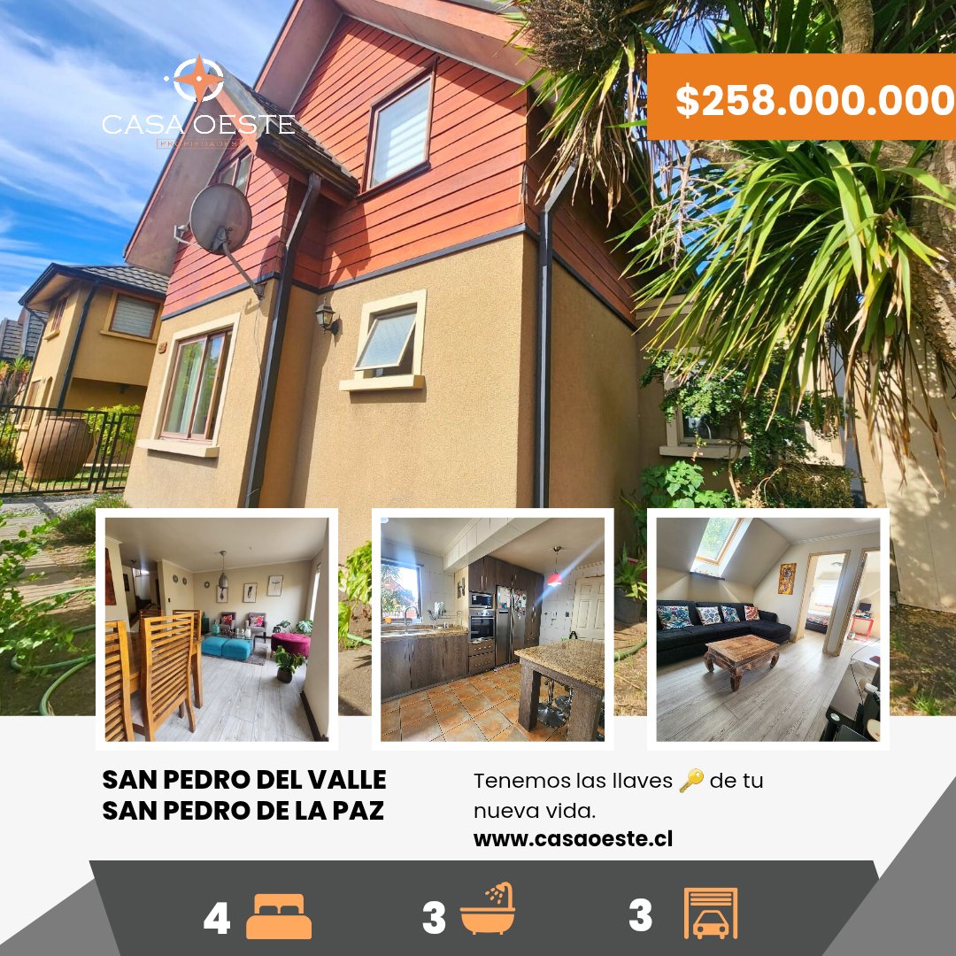 CASAOESTE VENDE ¡Amplia y luminosa casa familiar modelo Ranco en San Pedro del Valle! Disfruta de la comodidad y amplitud de esta excelente propiedad al exterior de condominio, con acceso directo a la laguna y rodeada de servicios, comercio, colegios y áreas verdes. Distribución perfecta para la vida en familia: Primer nivel: • Living comedor • Cocina independiente amoblada y equipada con comedor diario • Logia • Dormitorio principal en suite con walking closet • Baño de visitas Segundo nivel: • 3 amplios dormitorios con closet • Gran sala de estar • Baño compartido • Mansarda Extras que encantan: • 126 m² construidos / 240 m² de terreno • Estacionamiento para 3 vehículos • Antejardín y amplio patio trasero • Quincho, bodega y ventanas termopanel Valor: $258.000.000 Honorarios del 2% sobre el valor de venta, exento de IVA. Contáctanos a info@casaoeste.cl ¡Tenemos las llaves de tu nueva vida!
